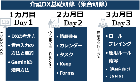 Googleツールを活用した研修となります。月に1度の研修で3カ月間で行います。